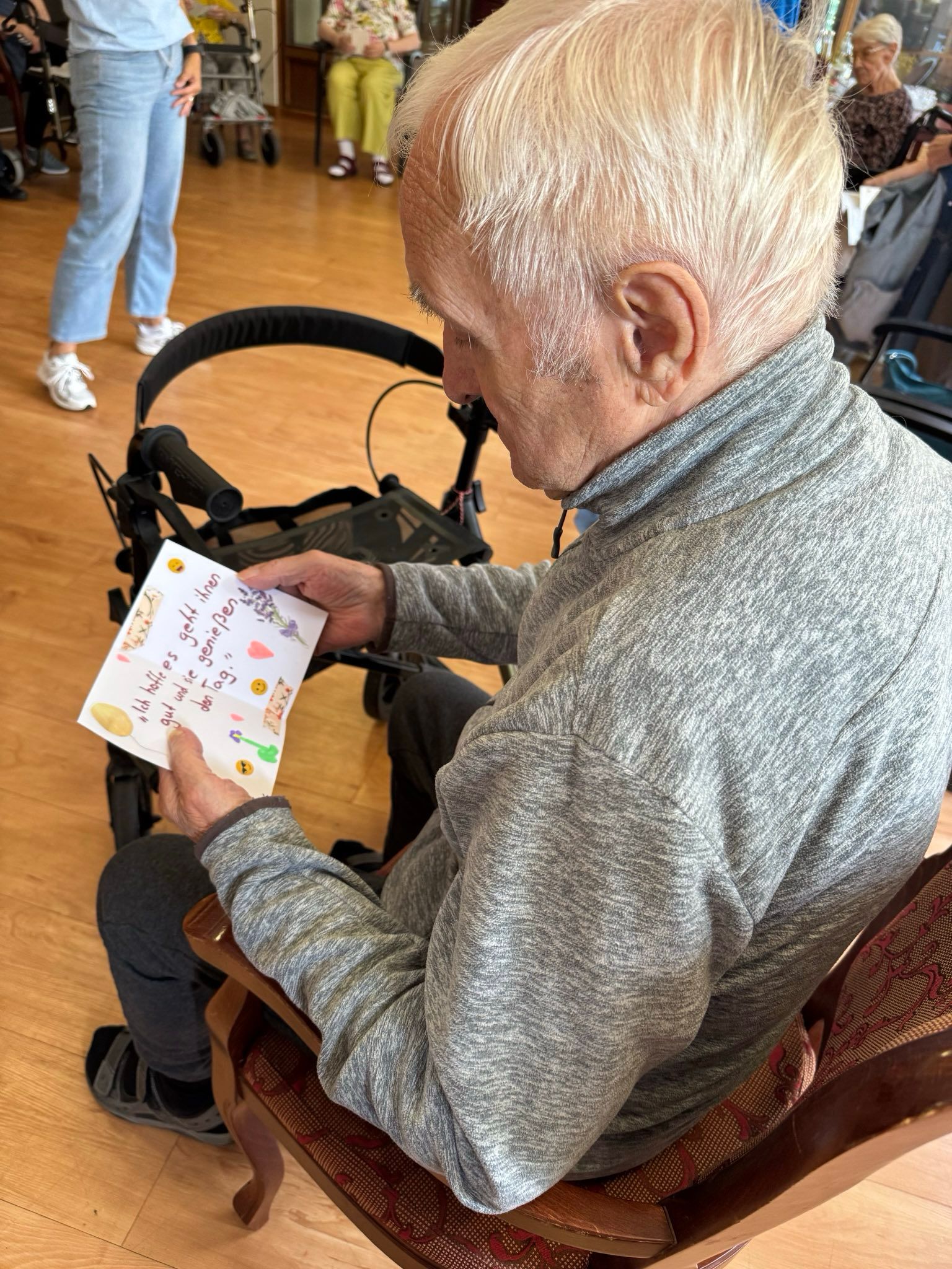 Ein besonderer Höhepunkt war die Übergabe von liebevoll gestalteten Karten an die Bewohnerinnen und Bewohner. Diese Karten wurden von Kindern geschrieben und bunt bemalt. Sie enthielten persönliche Worte, Grüße oder einfach nur eine kleine Botschaft der Hoffnung und Verbundenheit. Für die Bewohnerinnen und Bewohner waren die Karten eine schöne Überraschung, die ihnen ein Lächeln ins Gesicht zauberte und zeigte, dass sie nicht vergessen sind.